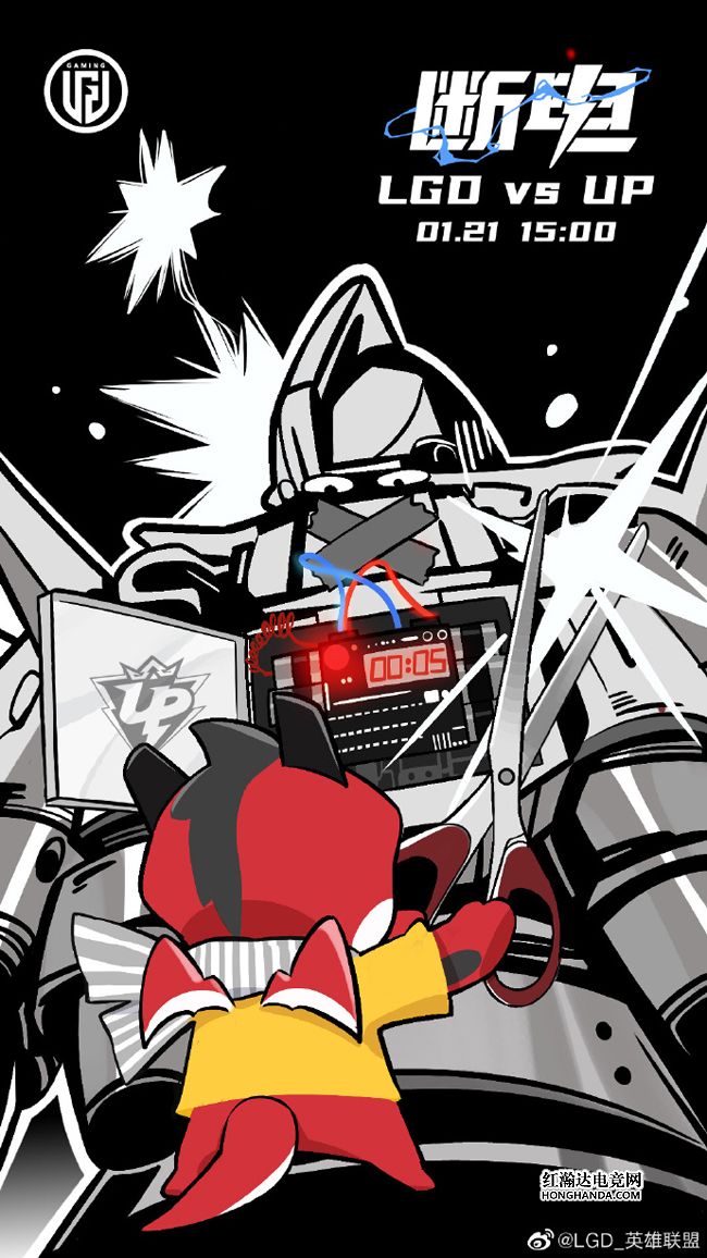 LGD的海报标题是“断电”,小红龙化身“爆破专家”,手拿大剪刀打开了UP机甲战士的背部能量仓门,它体内的定时炸弹只差5秒就会自动引爆,一红一蓝两根电源线赫然在目,不知LGD能否成功“断电”,拿到春季赛首胜?