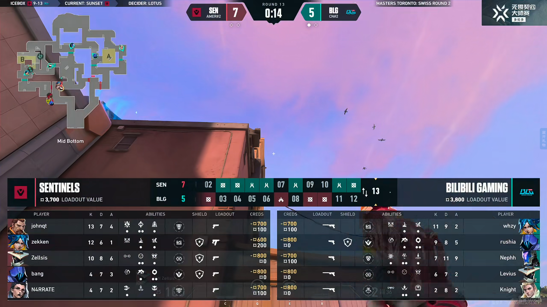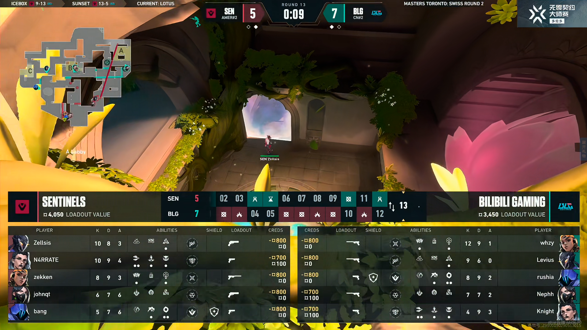 下半场手枪局Zellsis正义三杀拿下,第15回合SEN来回转点将BLG的道具全部骗出,最后SEN打A,BLG回防过于着急,whzy直接出烟干拉被打掉,BLG选择保枪。SEN下半场连拿四分,第18回合SEN提速A点,BLG回防前后夹击,正面被SEN全部打掉,whzy回防冥驹空枪被打掉。第19回合BLG在BC两点的完美防守协同再得一分。BLG没能把握住机会,被SEN连拿三分拿下,SEN 13-9赢下莲华古城。