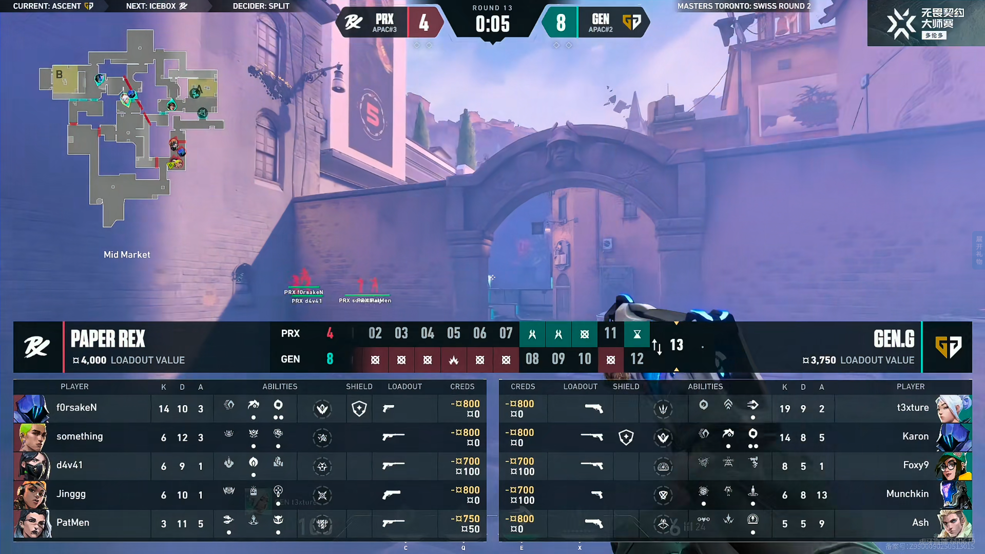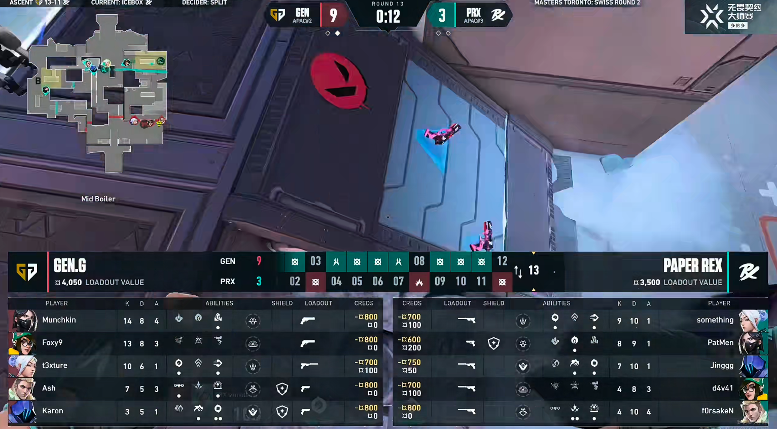 上半场GEN赢下手枪局,PRX奖励分轻松拿下。第4回合PRX在B点骗出道具后直接转A,但Munchkin在点内一人成军连打五人拿到ACE。第7回合t3冥驹被逮捕,PRX铺开技能提速进A,GEN回防交出奇乐大招与蝰蛇大招,在毒雾里强拆拿下。GEN连拿四分,第8回合PRX打A抓到GEN四人,PatMen蝰蛇开大覆盖包点,t3选择保狙,PRX拿到第2分。GEN打出一波三连胜,上半场GEN 9-3 PRX。