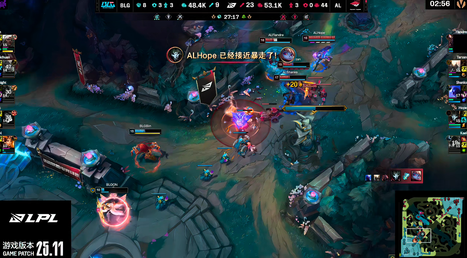 进入中期Shanks的瑞兹已经对位领先3级,在22分钟AL打出1换4,虽然Shanks阵亡但AL团战大获全胜,Hope烬砍下三杀。BLG已经开始上头,辅助“遛弯”被抓。在27分钟再度打出1换3,BLG彻底溃败大龙也无力去争。AL拿下大龙开始推进,但Knight岩雀打团W抬人帮队伍拖住。