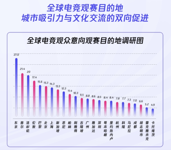 《报告》指出,举办2024年电子竞技世界杯的利雅得在24个观赛目的地城市中位列第11位,超越科隆、哥本哈根等电竞名城。这表明电竞有效促进了城市吸引力提升与文化双向交流,加深了观众对海外城市的认知,并有力助推海内外观众转化为城市游客。