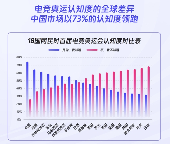 2027年,首届电竞奥运会即将在沙特阿拉伯举办,《报告》显示中国受访者对电竞奥运会的认知度达到73%,居于全球前列,越南、沙特阿拉伯位居二三位。菲律宾、印度尼西亚等新兴市场对电竞奥运会和虚拟体育项目的态度积极程度更高。