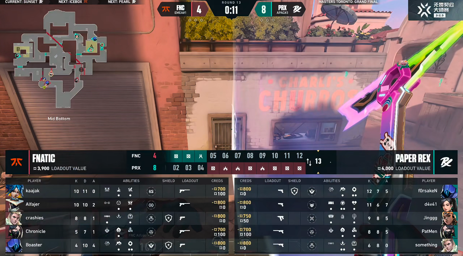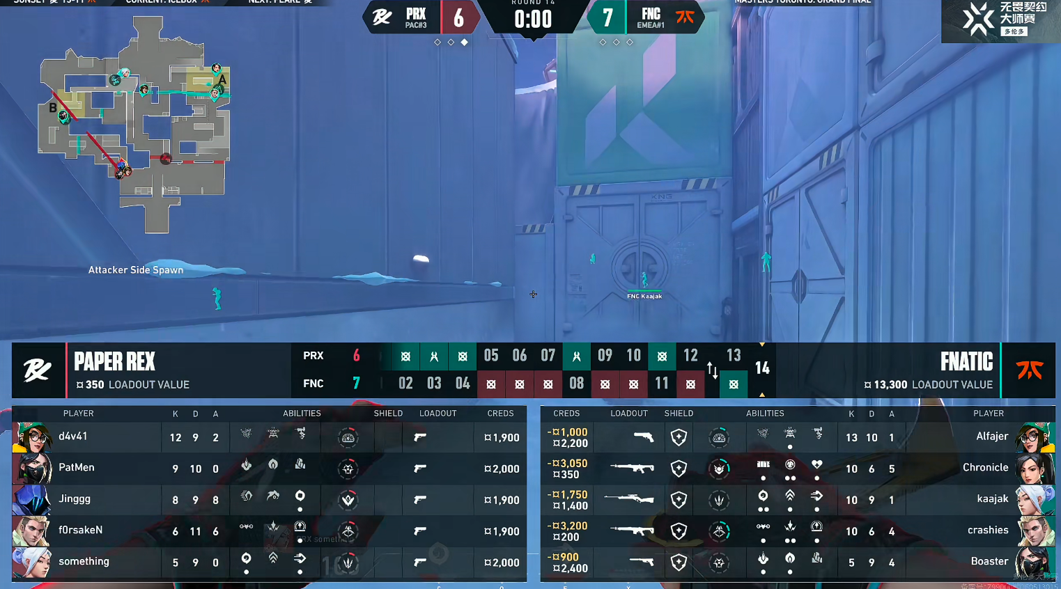 下半场FNC赢下手枪局打出四连胜,第17回合PRX打B艰难下包,FNC回防四打二被PRX给逆转,PRX拿到首分。第19回合kaajak的冥驹在A点给到PRX巨大的压力,kaajak打掉两个,与队友一同回防打赢拿到赛点。PRX面对拿到赛点的FNC,依然没有放弃,PRX连追四分,在第24回合PRX打A下包,并顶住FNC的回防赢下,PRX连追五分将比赛打到加时。