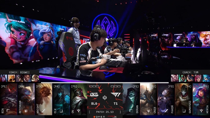 BLG开局便发起一级团进攻,抓到Faker的瑞兹,由Knight的阿狸拿下一血。虽然前期通过换线尝试拉开节奏,但被T1迅速识破,ON的酒桶在上路被击杀,Bin的安蓓萨与Elk的霞也因换线导致经验亏损,BLG前期节奏遭到严重打乱。