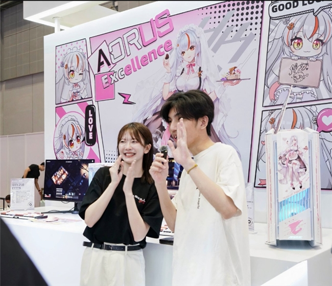 由AORUS B850M主板搭配技嘉破空C201机箱打造的耀白之境展区,萌萌的女仆雕妹忍不住和自己的次元形象近距离合影。就连前TEC.Blackovo也不能抗拒这样萌萌的硬件专区的吸引力。