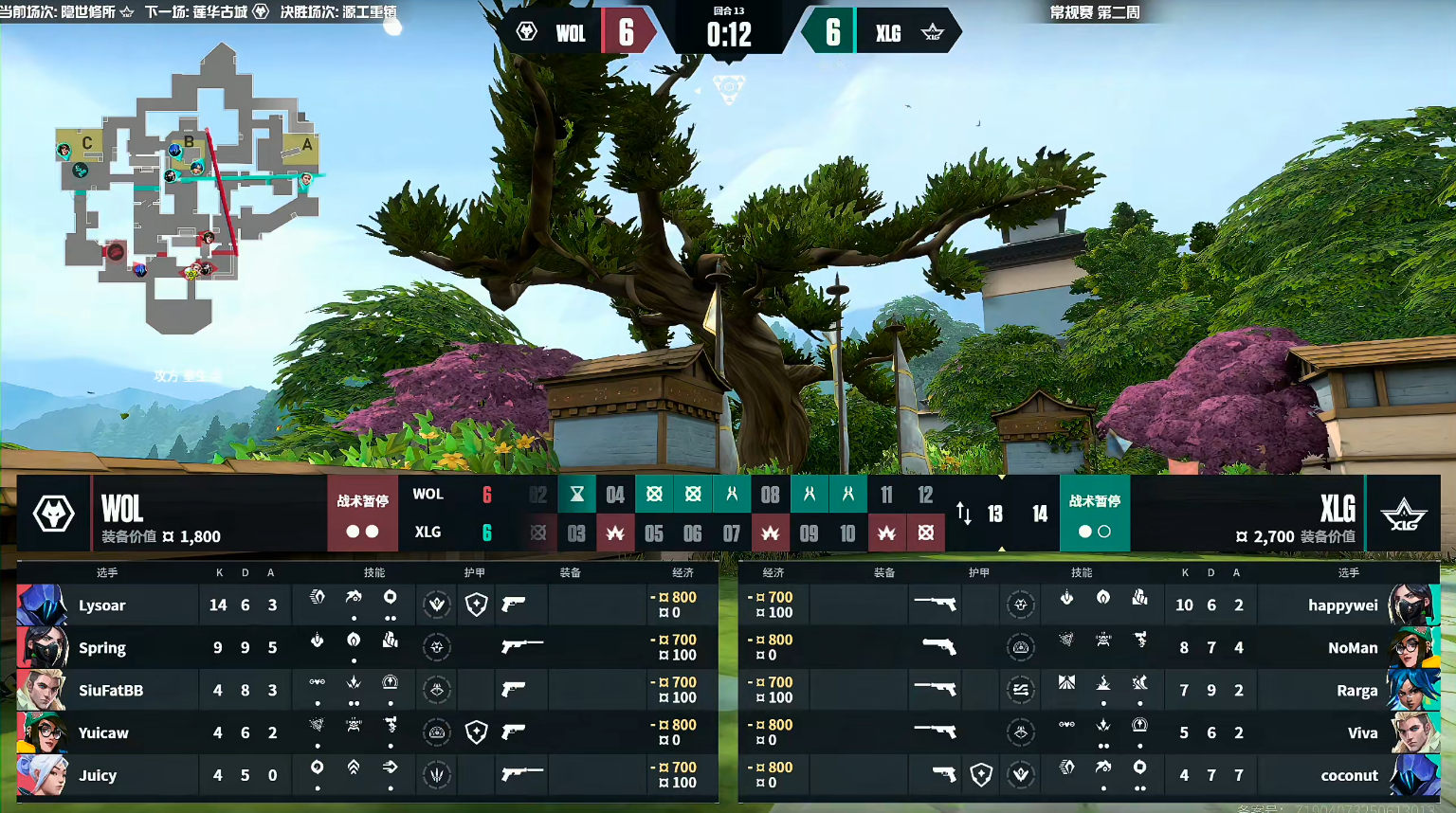 上半场XLG赢下手枪局,WOL第3回合在C点跑打打掉XLG的控场幽影,随后又在车库与B点打掉XLG赢下奖励分。第5回合狼队在A点架住XLG的进攻赢下,狼队连下两分,第7回合狼队回防A点三打二将XLG给打掉。狼队打出三连胜,第8回合XLG的EOC局抱团打A,打掉狼队三人后,成功完成存钱分的翻盘。第9回合Lysoar在A点防守打掉三人成功立功。上半场双方进攻防守打的十分焦灼打成6平。