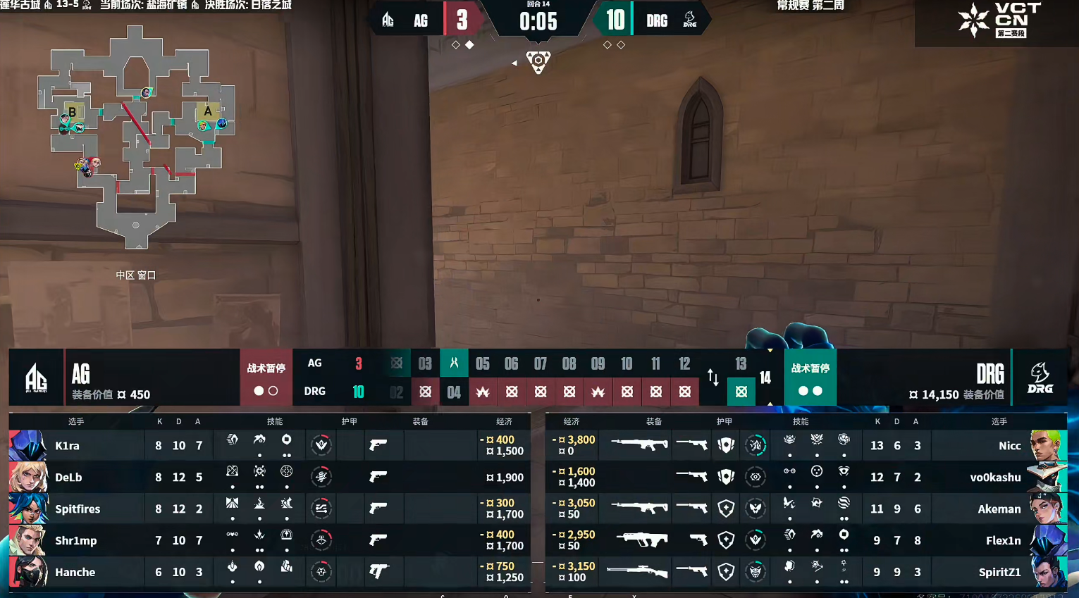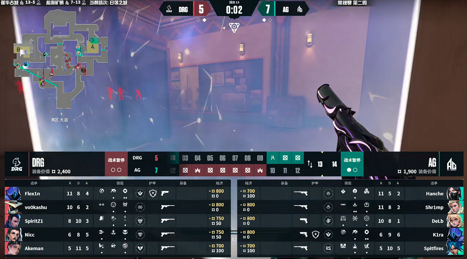 下半场vo0kashu的发挥带队赢下手枪局。AG赢下奖励分,第16回合AG在B点打掉DRG的回防拿下。K1ra连续两个回合的点内三杀,帮助队伍拿到赛点,第18回合DRG防守变奏主动前压,但AG直接快速进点,双方攻守互换,AG在点内守包赢下,AG打出一波四连胜,以13-5赢下莲华古城。