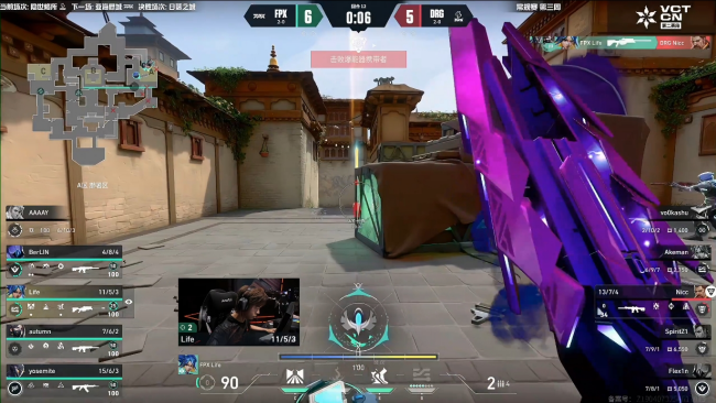 DRG再次赢得手枪局并且顺势收下经济分,随后双方展开了精彩的攻防大战,FPX在长枪局把比分追上,双方咬的很紧。第12回合,FPX利用幻棱大招强行突进A区安放爆能器,奇乐独自摸进中路干扰DRG的回防,帮助FPX成功拿下胜利,双方以6:6的胶着状态结束上半场。