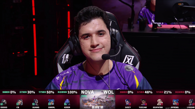 WOL拿下开局两分,但来到长枪局以后NOVA的包夹回防表现非常强势,GuanG今天的枪感火热,带领队伍打出一波四连胜,迫使WOL交出第一个暂停来调整。暂停回来WOL拿到一分,但继续被NOVA压制,第10回合WOL艰难地再拿一分以后NOVA没有继续给出机会,强势的包夹把WOL的进攻角度压缩到最小,把上半场的最后两回合全部拿下,以8:4的优势进入下半场。