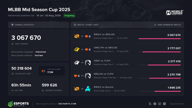 根据第三方电竞权威数据网站Esports Charts统计,本届MSC刷新多项收视纪录。赛事峰值观看用户突破306万,强势登顶电竞世界杯历史收视之巅;观看时长高达5031万小时,平均观看用户突破59万,再次巩固了MSC作为电竞世界杯头部赛事的地位。