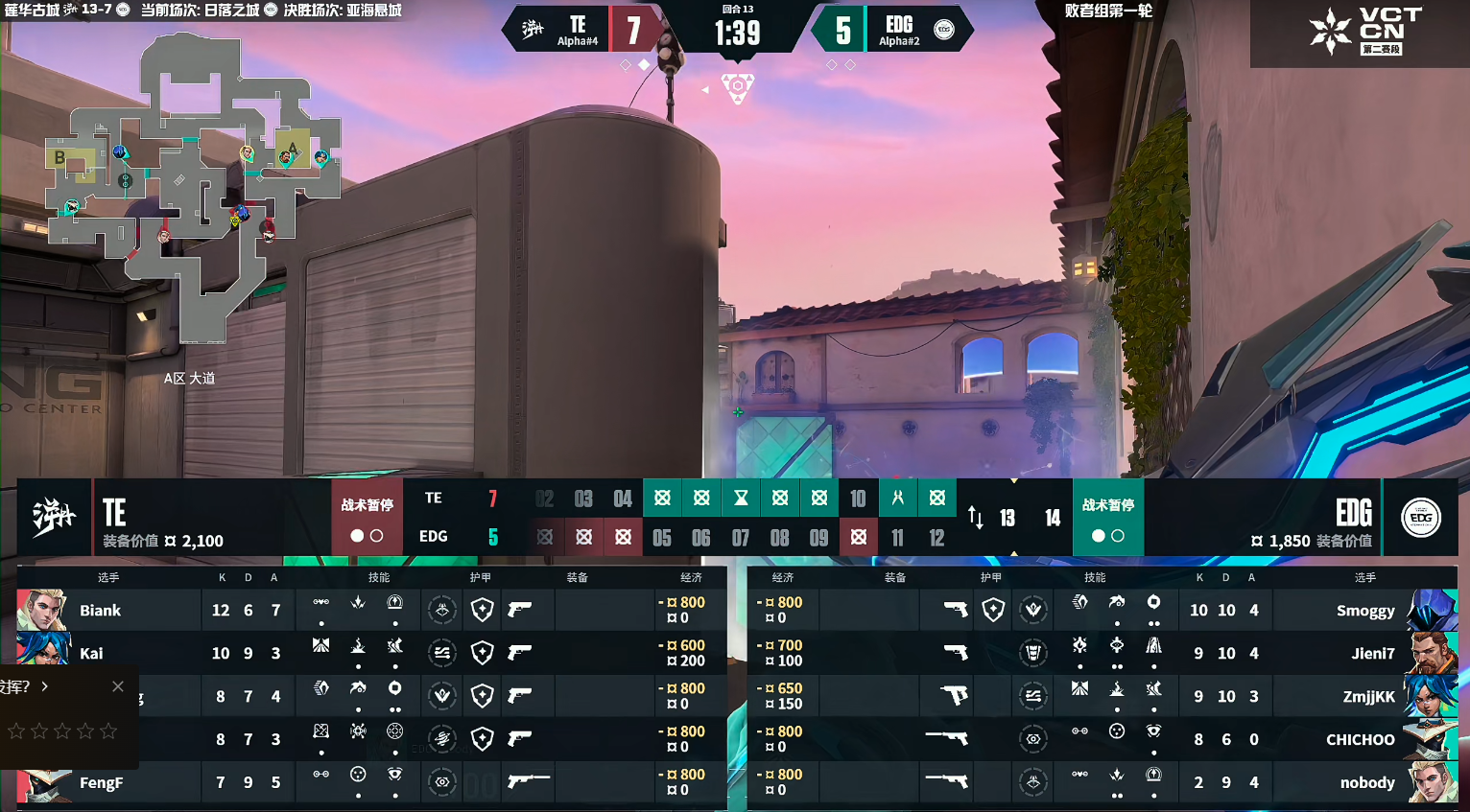 上半场EDG赢下手枪局并打出四连胜,第5回合EDG提速B点,被FengF打掉两个,TE其他四人回防打掉EDG赢下首分。TE连拿五分,第10回合EDG终于拿到第五分,第11回合EDG提速B点交出铁臂与猎枭两个大招,TE回防寻敌箭拿到信息将EDG迅速打掉,TE连下两分,以7-5结束上半场。