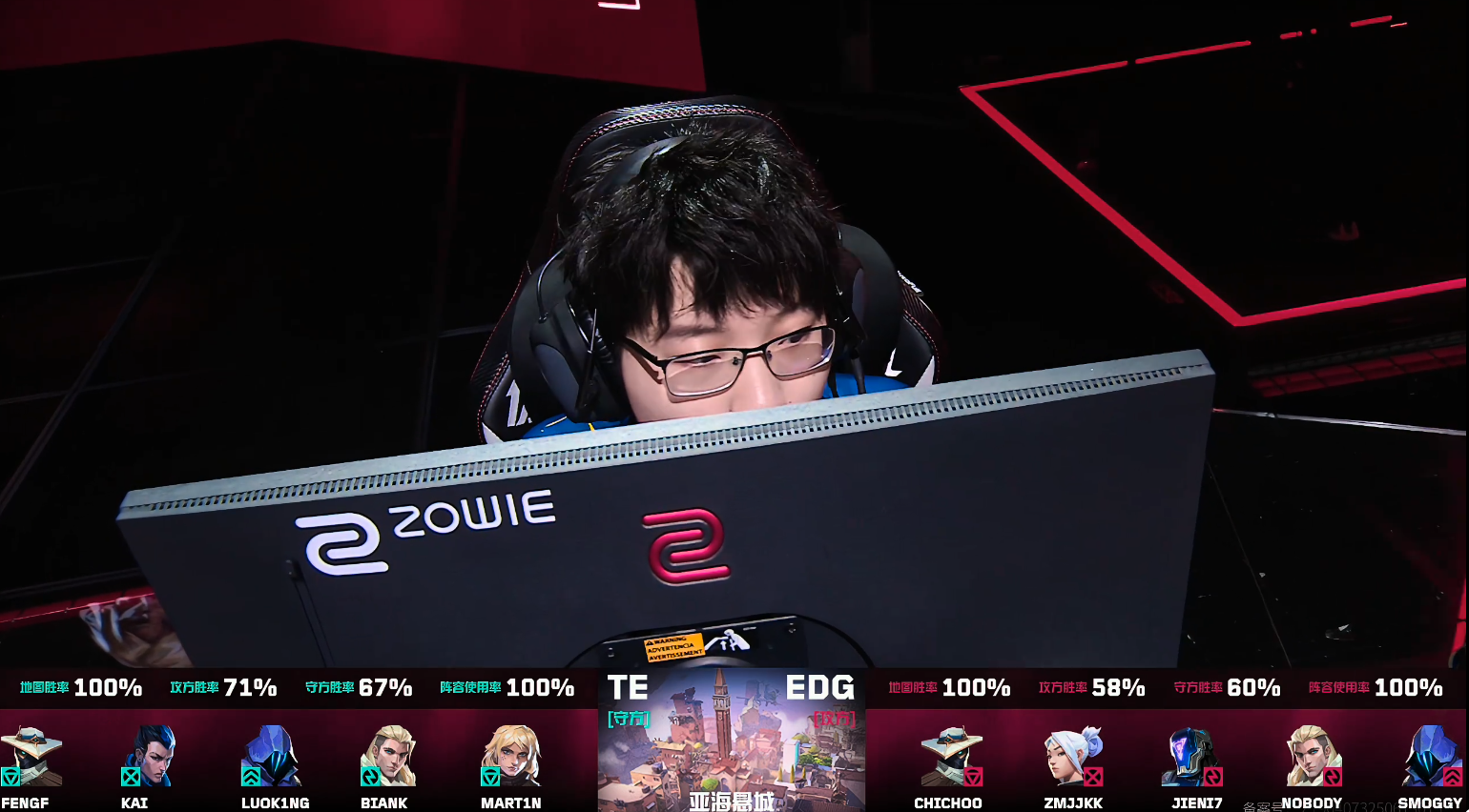 上半场TE赢下手枪局,第4回合EDG利用技能铺设进入B点,Jieni7与nobody的守包双拉成功拿下。第5回合Jieni7一波四杀扼杀了TE想要翻盘的想法。EDG连下四分,第7回合EDG进入A点后,没人架下拉门,被FengF混烟出打赢回防终止连败。TE打出六连胜,以8-4进入下半场。