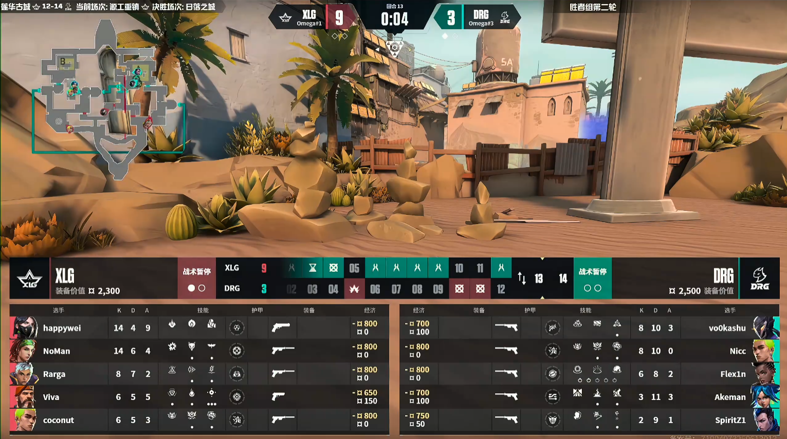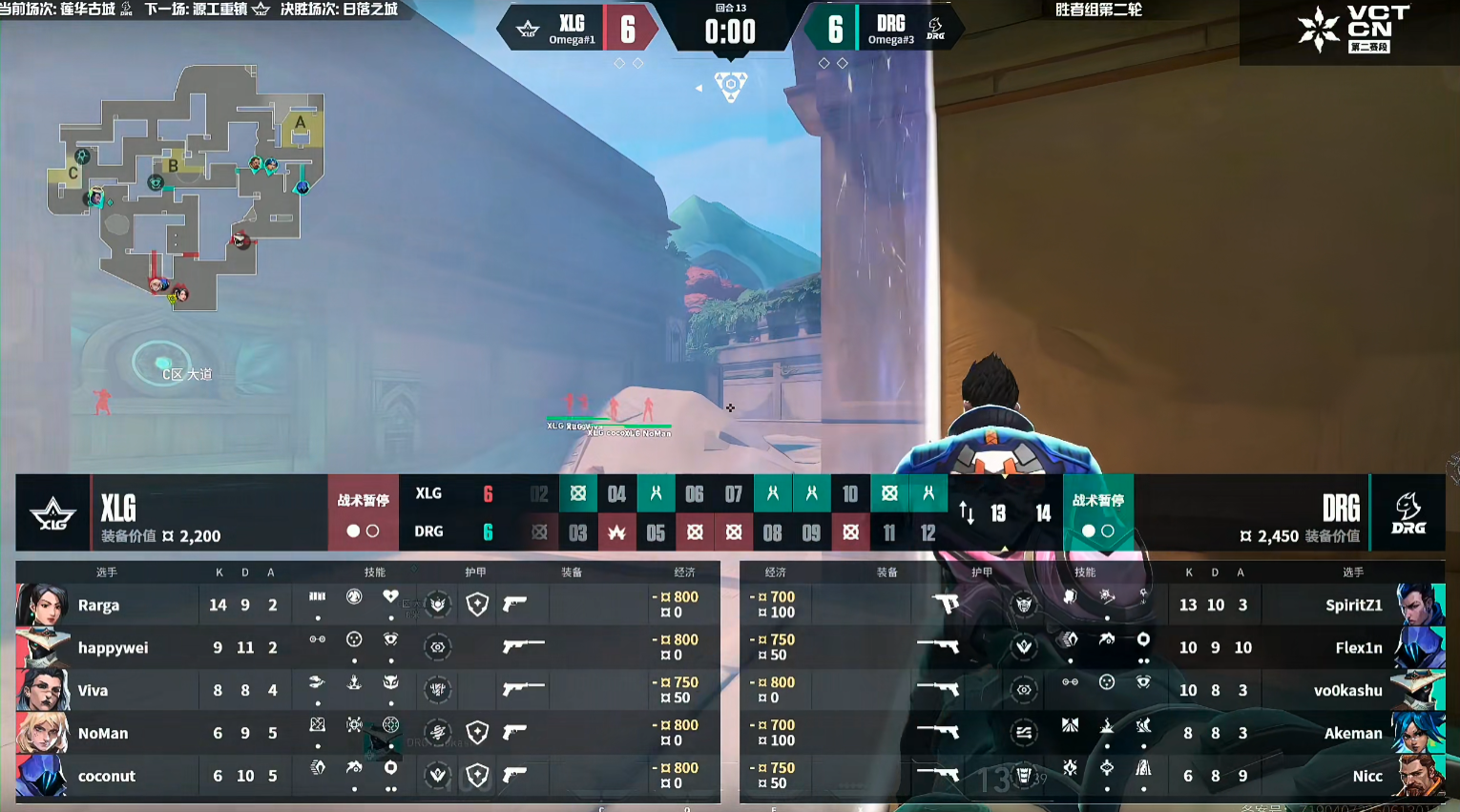 上半场DRG赢下手枪局,随后Rarga在第3回合打出ACE赢下奖励分。随后DRG重新掌控局势并打出七连胜。第11回合DRG声东击西,但被Rarga架住过点拿到首杀,DRG等待技能CD后一波推进在点内双架打掉XLG的回防赢下。第12回合DRG提速B点快速下包,XLG回防成功打赢拿到第2分。上半场DRG 10-2 XLG。