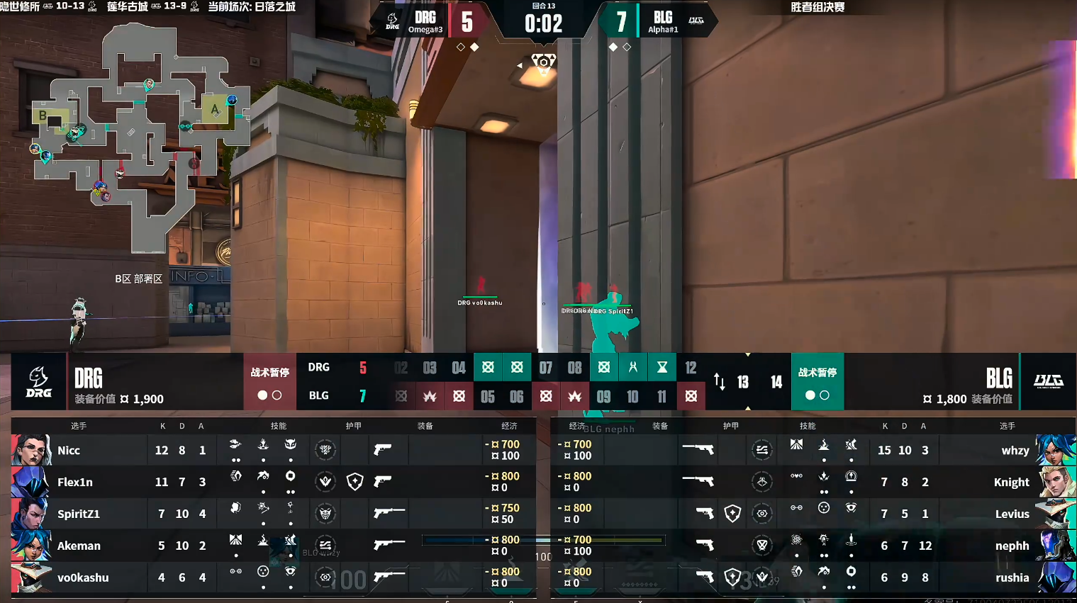 下半场BLG赢下手枪局,第16回合长枪对决,BLG打C逐个被DRG给打掉。DRG打出四连胜将比分追平。第19回合BLG在B点下包,面对DRG的回防小K打赢残局。第21回合DRG AC两点前压拿到信息,BLG打B不成后选择突破A点的防守,一波A点的3v5成功赢下。第22回合赛点局BLG在C点下包后,nephh拿下残局砍下四杀,BLG 13-9赢下图二。