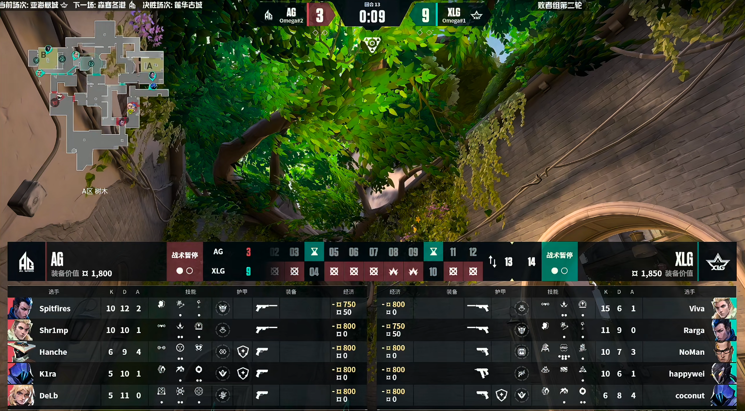 上半场AG开局打出七连胜,第7回合K1ra更是在刀了NoMan。第8回合XLG快速rush A,一波快攻技能铺开,打了AG措手不及,XLG拿到图二的首分。第9回合XLG继续提速B点,但一直控不下点后,XLG勉强下包后被AG打掉。第10回合XLG在A点下包,直接包点强守,Shr1mp回防四杀但最终被Viva给打掉赢下。XLG上半场进攻受挫,控图、对枪等都有些马,AG则是在防守打出气势,并拿到9分。