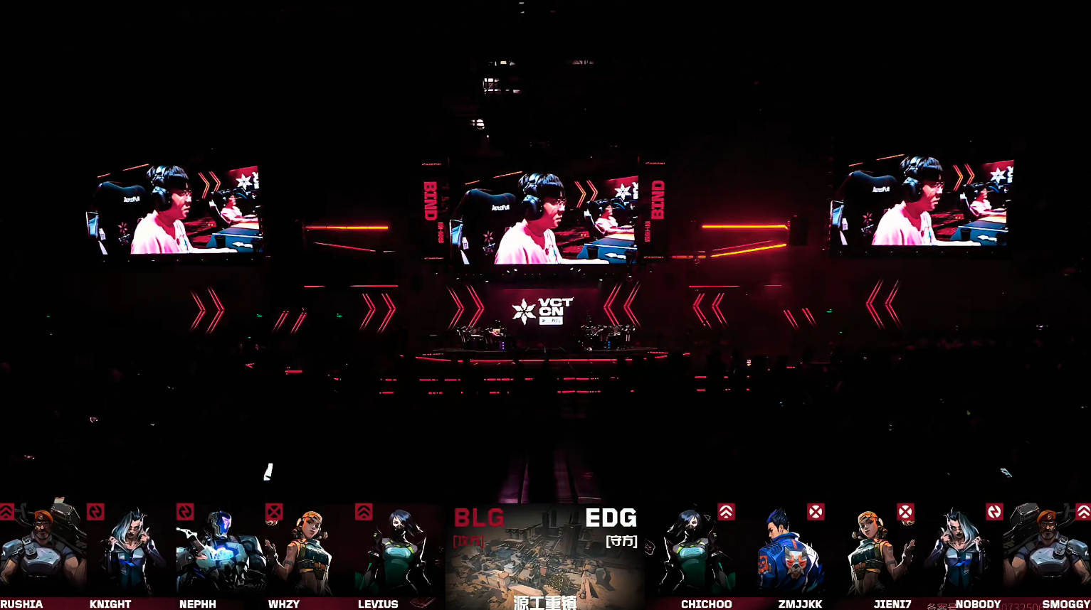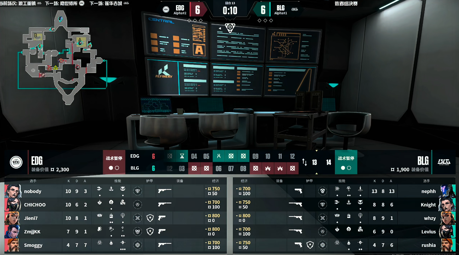 上半场EDG赢下手枪局,BLG赢下奖励分并打出三连胜。球球连续两把保枪,第6回合EDG再度起到长枪,BLG快攻C点迅速站住,并打掉回防的EDG赢下。第8回合EDG再度起到长枪,Smoggy在B点拿到首杀,并与队友一起回防A点打赢。BLG重新主导比赛并打出四连胜,上半场BLG 9-3 EDG。