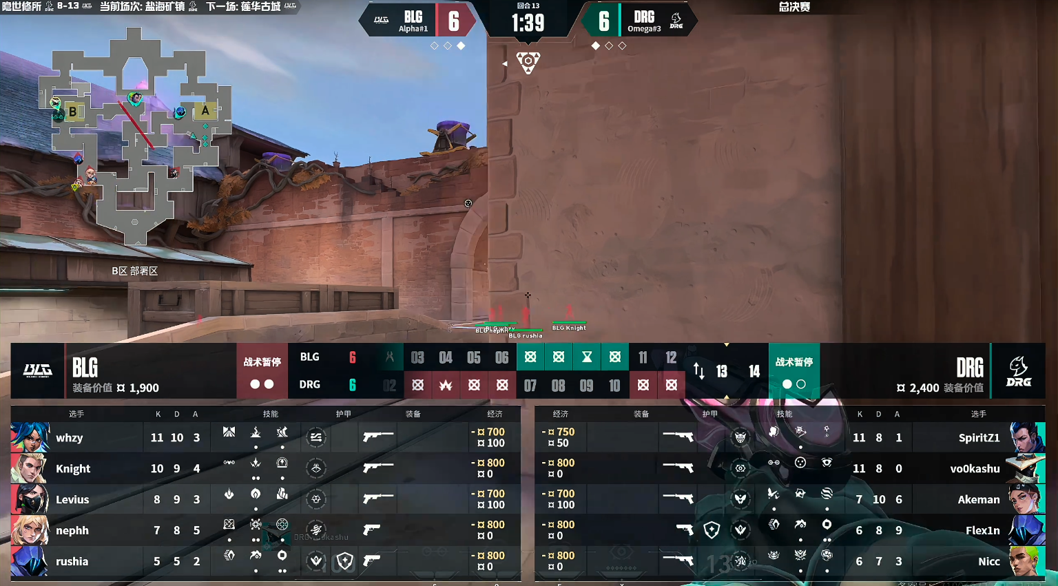 上半场BLG赢下手枪局,DRG奖励分开始连追三分,第5回合rushia回防C点打出一个ACE赢下。第9回合BLG守住C点,通过技能协同与多条枪线将DRG的进攻化解。BLG随后打出五连胜,第12回合BLG强势守住C点赢下,上半场BLG 8-4 DRG。