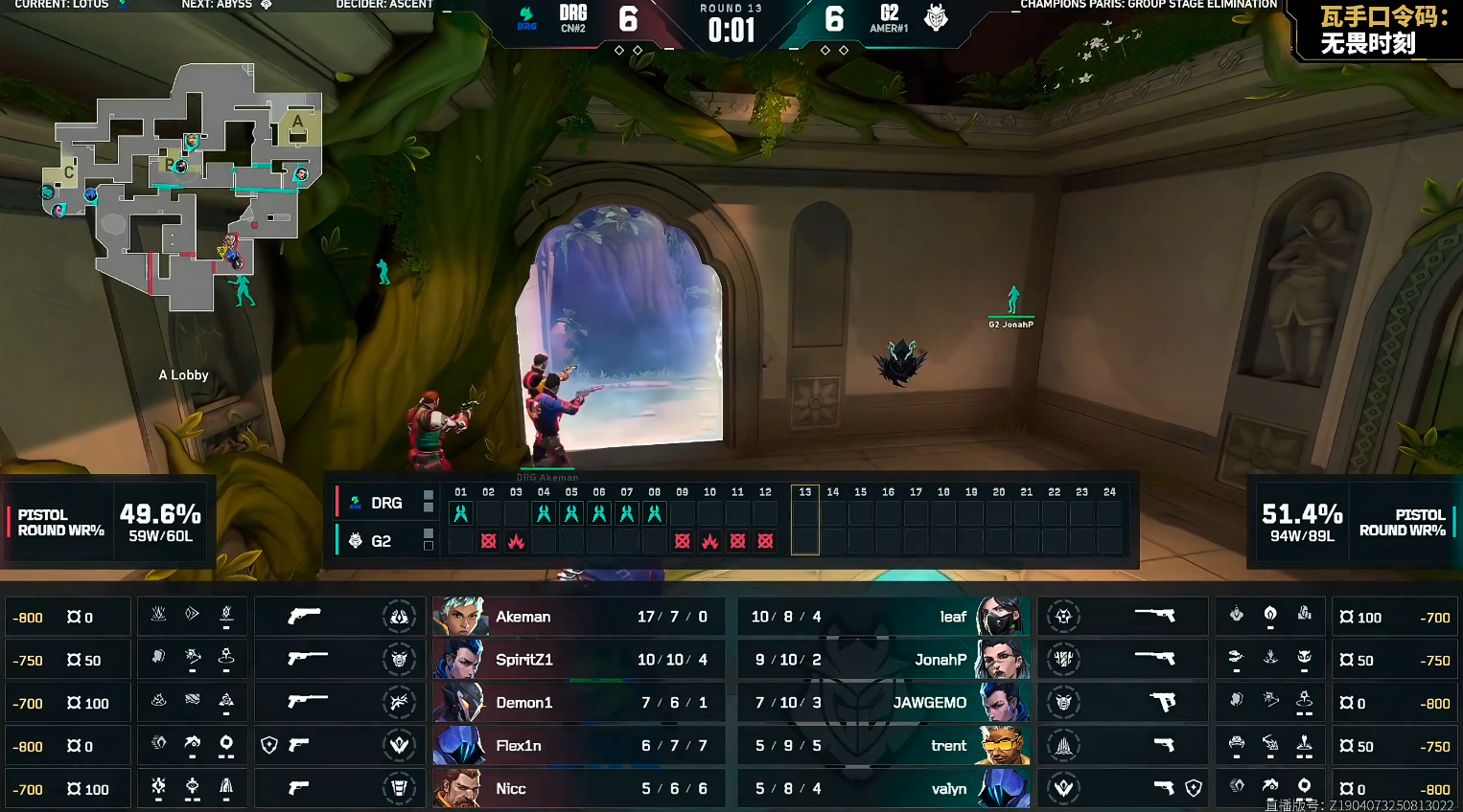 上半场G2赢下手枪局拿到四分。第6回合DRG打B拿下,这分Demon1三杀带队拿下。第9回合DRG在A点前顶,打掉G2四人顶住回防,DRG完成一个ECO翻盘。在第二个暂停调整后,DRG起势得分,DRG一口气打出四连胜,将比分成功追平。上半场双方比分6-6。
