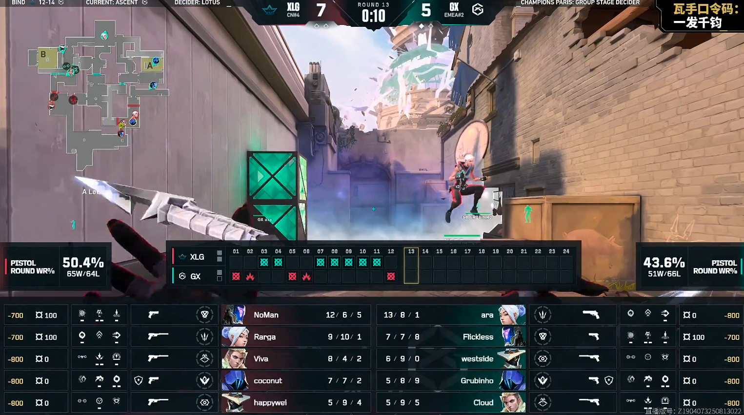 上半场XLG开局打出四连胜,第5回合ara冥驹直架浴室三杀拿到首分。第8回合ara与westside两人正义连下两人,帮助队伍完成存钱分的翻盘。GX连下三分,XLG在上半场最后两个回合赢下,上半场XLG 8-4 GX。