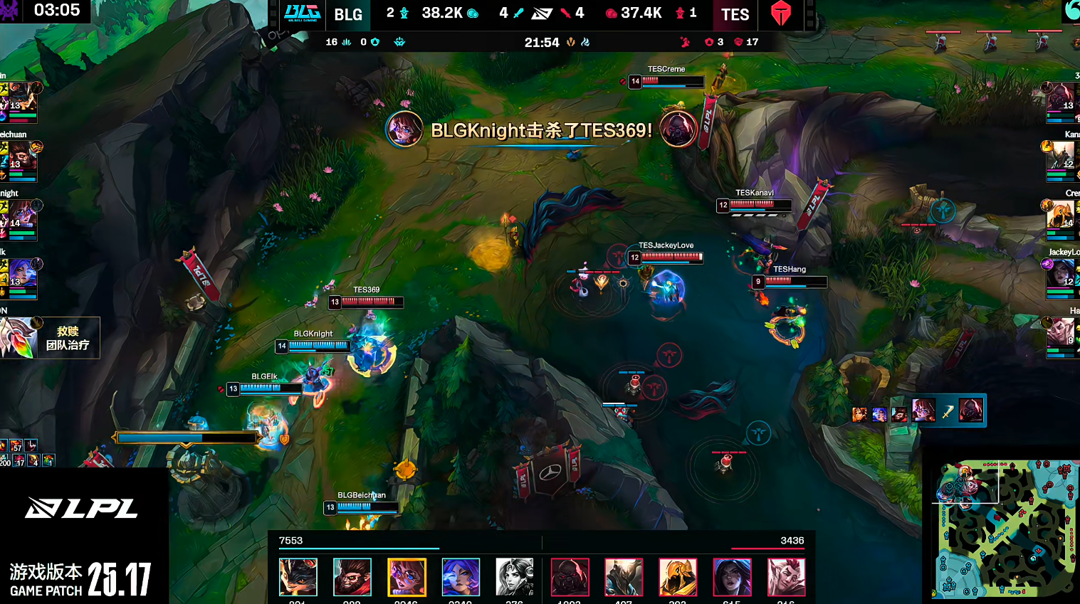 前期TES 9分钟上路一波越塔将BLG的上野击杀,BLG随后上头,陆续的“葫芦娃救爷爷”逐个送掉。这波团战打完,BLG进入了“发育期”。