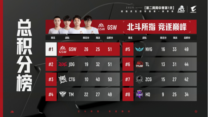 第一天结束后,GSW拿下榜首,随后是JDG和CTG,来自NVGR WIND拿到了战神榜榜首。