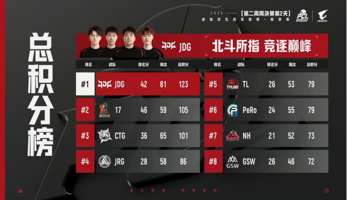 在9月14日 的第二阶段积分结算时,表现出色的JDG以123分稳稳占住榜首,随后是17占队和CTG,而来自JDG战队的SuZe则是获得了本轮的战神榜第一名。
