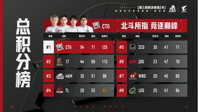 北斗所指,竞逐巅峰。绝地求生冠军联赛24支顶级战队分为A、B、C三组,经过常规赛、周中赛、周决赛的多轮对抗,正式角逐出了季后赛的名额。CTG战队后发制人,成功拿下常规赛第三阶段周冠军,17战队和4AM分别位居第2和第3。晋级PCL2025秋季赛总决赛的队伍分别是:CTG 、JDG 、17、TYLOO、4AM 、ZCG 、JRG 、PeRo 、GSW 、EDG 、GQG 、WBG 、NH、LEG、SMS 、TM,共16支战队。