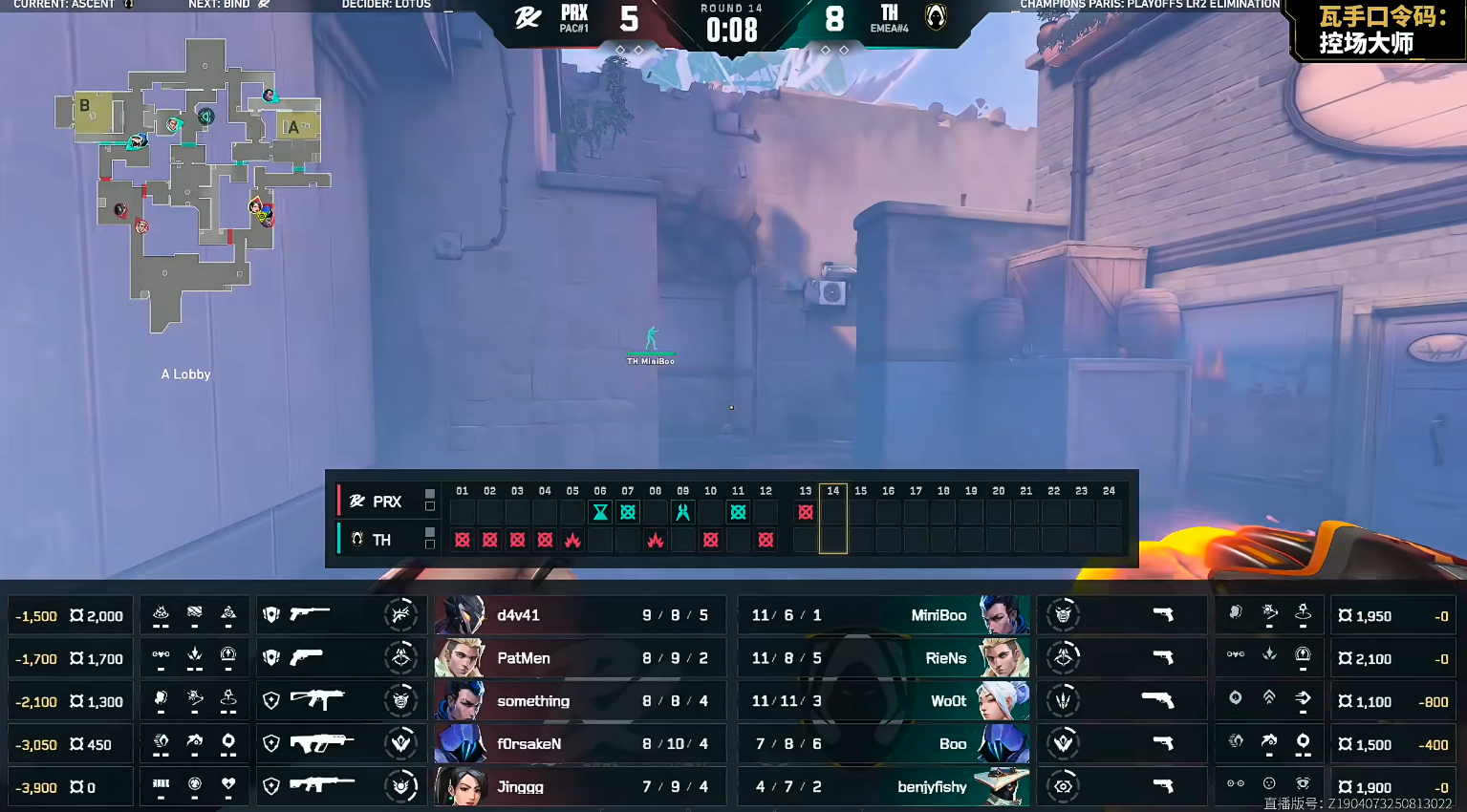 上半场TH赢下手枪分,第4回合的长枪对决,miniboo三杀守住AB连。第6回合PRX黑梦与维斯两个终极技能打A拿下第2分。PRX的暂停调整有效,并打出七连胜,而TH接连丢分,暂停调整之后依旧未能守住PRX的进攻。上半场PRX 8-4 TH。
