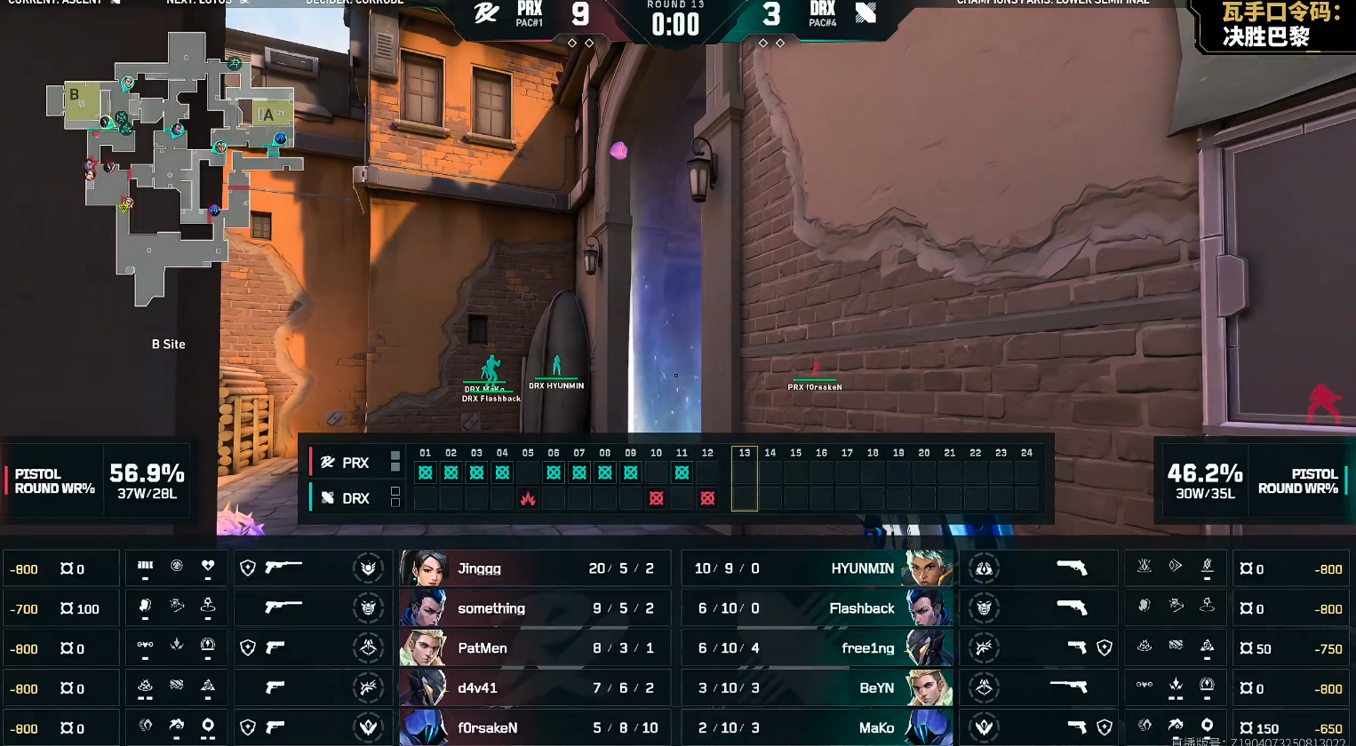上半场DRX拿下手枪局的胜利,PRX长枪分开始发力,双方开局比分一直没能拉开差距。第7回合d4v41回防C点对枪打赢。PRX连下两分将DRX首个暂停逼出来,第9回合BeYN摘掉Jinggg开大的雷兹,DRX这回合打B赢下。DRX打出四连胜,上半场拿到7分,PRX拿到5分。