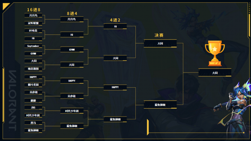 4进2阶段(BO3赛制):赛制升级为“多局博弈战”,考验战队战术储备与调整能力。半决赛中,「大同」与「IQ」展开多轮拉锯,前者凭借更丰富的战术变化拿下胜利;另一边「鲨鱼辣椒」与「HAPPY」激烈交锋,最终「鲨鱼辣椒」以更稳定的发挥晋级,与「大同」会师决赛。