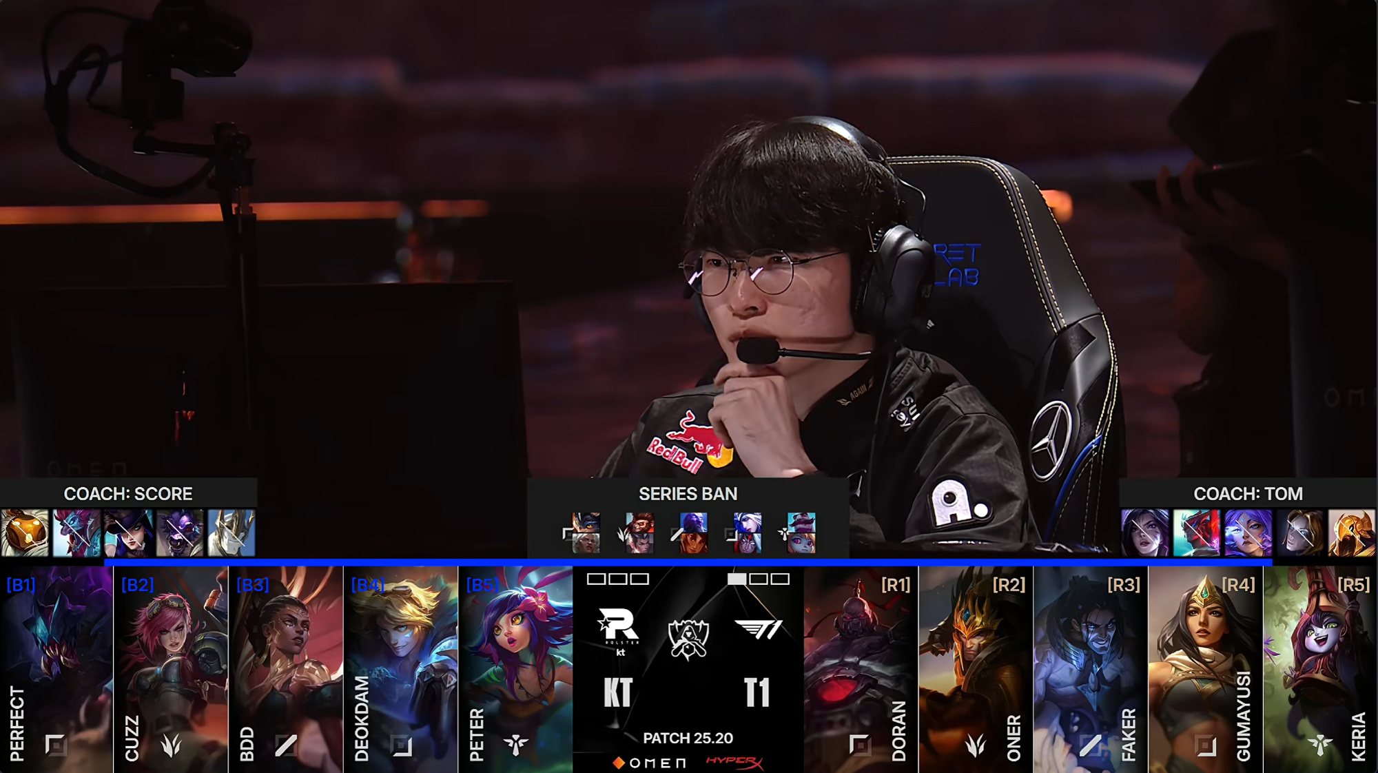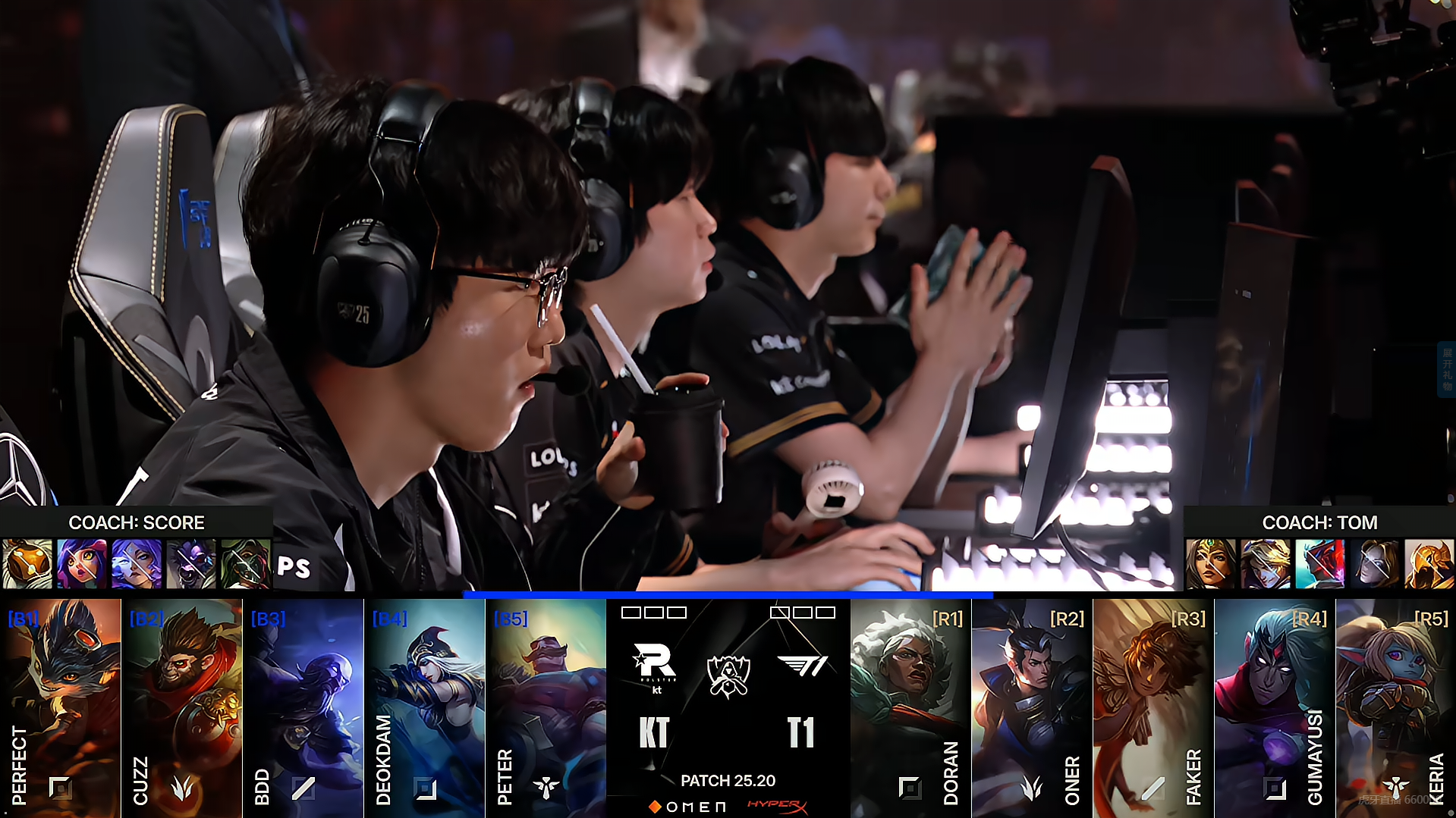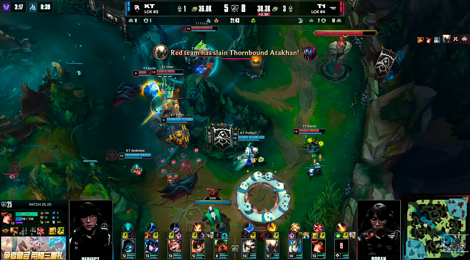 比赛15分钟T1中野在上路主动出手抓Bdd梅尔,KT的支援非常迅速,野辅赶到上路将T1中野击杀,KT随后控下先锋。18分钟Cuzz蔚被T1抓到秒掉,随后小龙团T1将KT其余四人击杀,两队复活后继续争夺小龙打团,KT打出2换5,连续的两波团战,Bdd梅尔输出拉满,反而是Faker有些着急,T1逐渐无法处理Bdd梅尔。