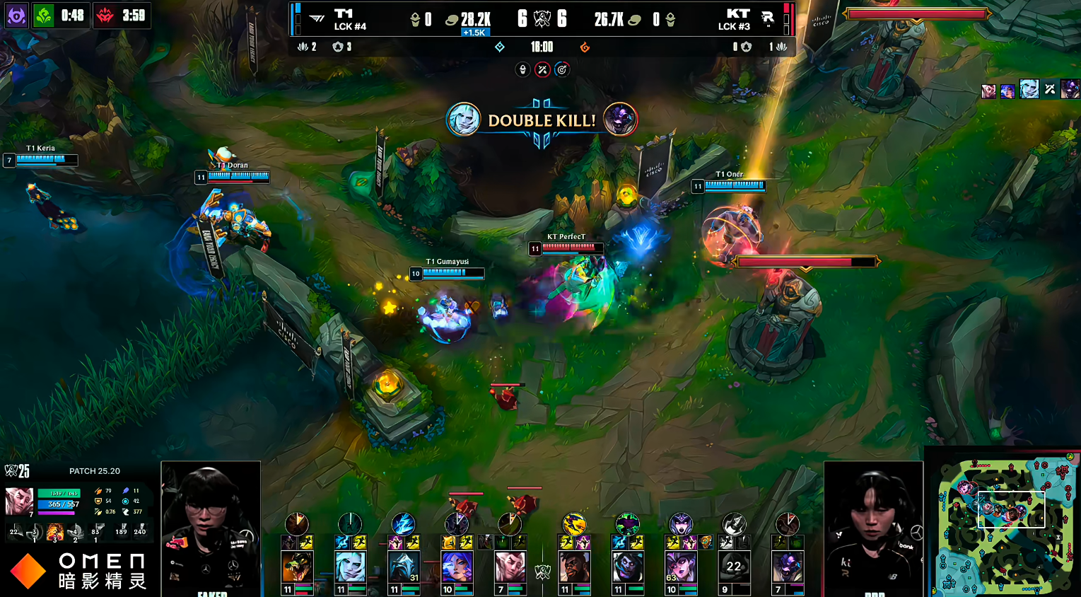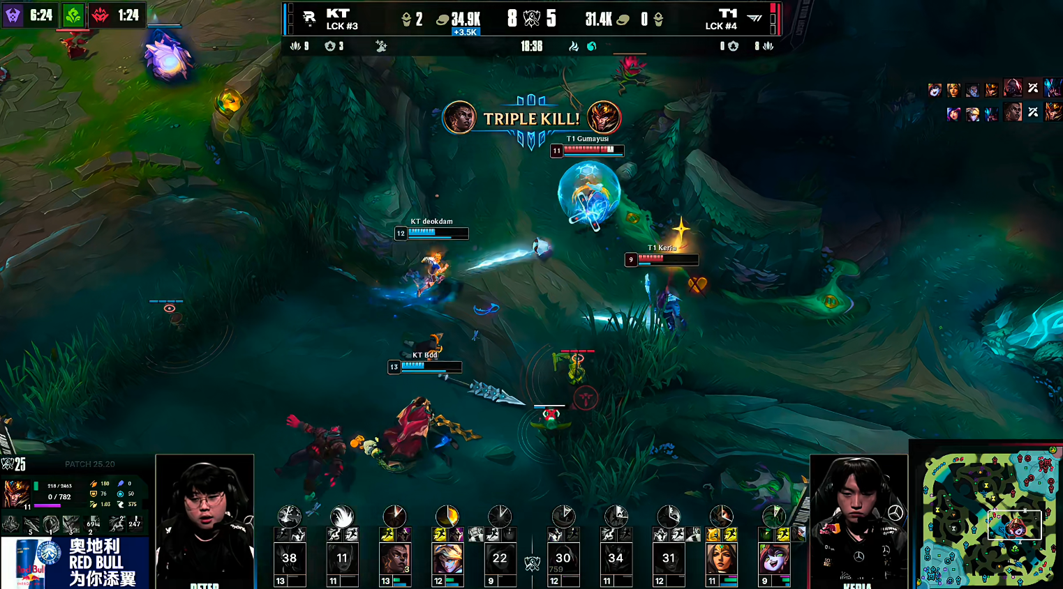 比赛开局3分钟,Oner潘森变奏来到上路,帮助Doran青钢影拿下一血。随后又是T1的上野发力,继续针对KT的上单约里克,将其击杀。Doran青钢影换到下路,与野辅一起将KT泰坦击杀,最后吉格斯大招收掉Keria蕾欧娜。