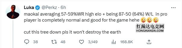 Perkz发文说道:茂凯在高分段中平均胜率在57%-59%之间,但是它在职业选手之间的胜率是64%(87场50胜)。居然说“这是完全正常的并且对比赛有好处”,我真的呵呵。请削弱这棵树吧,这并不会对地球有什么危害。从Perkz这急切的表达中就能看出,他已经很烦躁大树了,可能这个英雄影响了他的发挥吧。