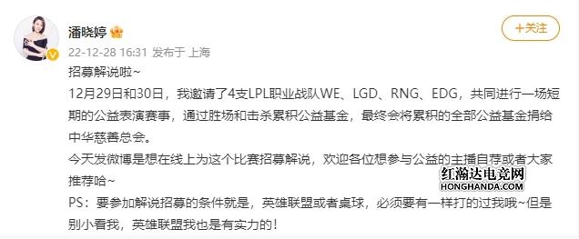 昨日“九球天后”潘晓婷更博表示自己将邀请4支LPL职业战队WE、LGD、RNG、EDG,共同进行一场短期的公益表演赛事,通过胜场和击杀累积公益基金,最终会将累积的全部公益基金捐给中华慈善总会。