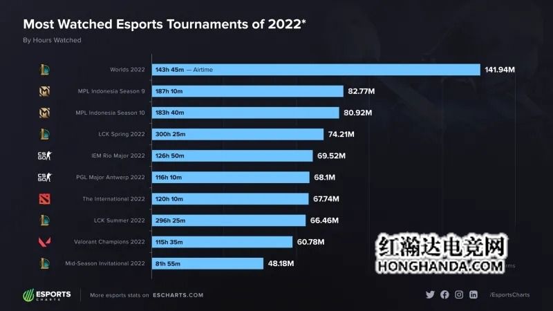 近日国外数据统计网站Esports Charts统计了2022年各项电竞赛事总观看时长和最高观看人数排名前十的电竞赛事,排名结果如下: