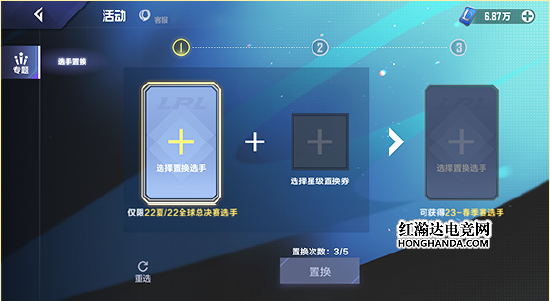 第1步选择用于置换的选手,第2步选择希望投入的星级置换券,第3步选择目标选手,最后点击“置换”按钮即可完成置换。