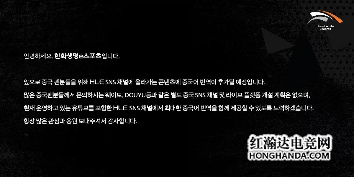 HLE官方发文说道:为了中国的粉丝,未来的HLE社交媒体平台上上传的网络内容将会添加中文翻译。很多中国粉丝询问的微博和斗鱼等社交平台和直播平台,目前我们还没有计划运营。我们会尽量在目前运营中的HLE社交媒体平台上提供中文翻译。感谢大家一直以来对我们的关心和支持。