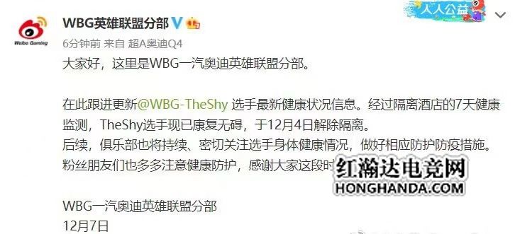 从那开始,粉丝们就不断地担心起了Theshy,毕竟大家都很想看见赛场上的他。最近WBG俱乐部终于发文说道:大家好,这里是WBG一汽奥迪英雄联盟分部。在此跟进更新WBG-TheShy 选手最新健康状况信息。经过隔离酒店的7天健康监测,TheShy选手现已康复无碍,于12月4日解除隔离。后续,俱乐部也将持续、密切关注选手身体健康情况,做好相应防护防疫措施。