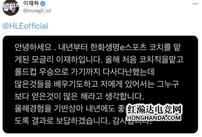 教练Mowgil发文说道:大家好,我是Mowgil,HLE2023的教练。从2022年开始,我在DRX开始我的教练生涯并获得了冠军,这是一个跌宕起伏的赛季。我学到了很多,明年我比任何人都期待地想做一些事情。基于这一年的经历,我会尽我最大努力带给大家一个好的结果,谢谢。