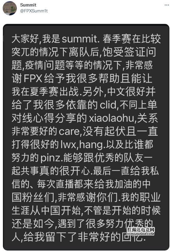 Summit发文说道:大家好,我是Summit春季赛在比较突兀的情况下离队后,饱受签证问题疫情问题等等的情况下,非常感谢FPX给予我很多帮助且能让我在夏季赛出战。另外中文很好并给了我很多依靠的Clid,不同上单对线心得分享的Xiaolaohu,关系非常要好的Care,没有起伏且一直打得很好的Lwx、hang,以及比谁都努力的pinz。能够跟优秀的队友起共事真的很开心,最后一直给我私信的、每次直播都来给我加油的中国粉丝们,非常感谢你们。我的职业生涯从中国开始,不管是开始的时候还是如今,遇到了很多努力优秀的人,给我留下了非常好的回忆。