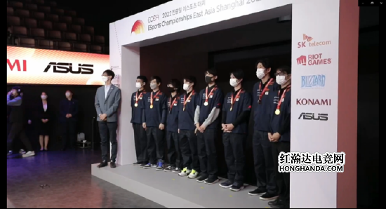 日本电竞联合会公共事务商务部户部浩史为日本代表队颁发第二届ECEA东亚电竞锦标赛金牌