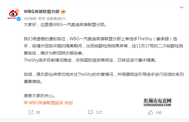 WBG官方发文说道:我们很遗憾的通知各位,WBG一汽奥迪英雄联盟分部上单选手TheShy(姜承録)选手,自境外回抵中国的隔离期间,出现核酸检测结果异常,经11月17号的二次核酸检测复核后,确诊为新冠肺炎感染者。TheShy选手目前情况稳定,依我国防疫政策规定,已转运进行集中隔离。Theshy之后也发文说道:请大家不用太担心,目前我状况一切都好,症状不严重,之后会好好隔离,听医生的指引。