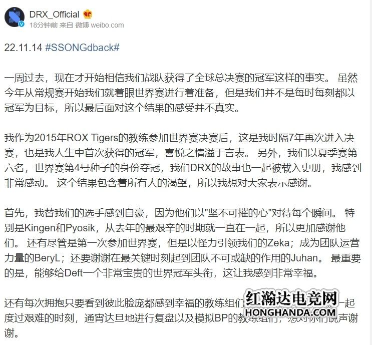 发文说道:首先,我替我们的选手感到自豪,因为他们以"坚不可摧的心"对待每个瞬间。 特别是Kingen和Pyosik,从去年的最艰辛的时期就一直在一起,所以更加感谢他们。 还有尽管是第一次参加世界赛,但是以怪力引领我们的Zeka;成为团队运营力量的BeryL;还要谢谢在最关键时刻起到团队不可或缺的作用的Juhan。 最重要的是,能够给Deft一个非常宝贵的世界冠军头衔,这让我感到非常幸福。