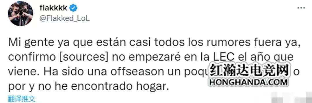 在Jankos说了自己的情况后,下路选手Flakked也发文说道:几乎所有的谣言都已经出来了,我确认我明年不会在LEC开始新的赛季。有一点可以确认的是这个是个疯狂的休赛期,我还没有找到队伍。也就是说,首先,我要再次感谢 G2 今年有机会实现我的梦想,并以他们力所能及的方式帮助我。然后关于我的未来,我自己也不太清楚,但我唯一的目标就是是重返LEC,并且展现出比我之前水平更高的表现。