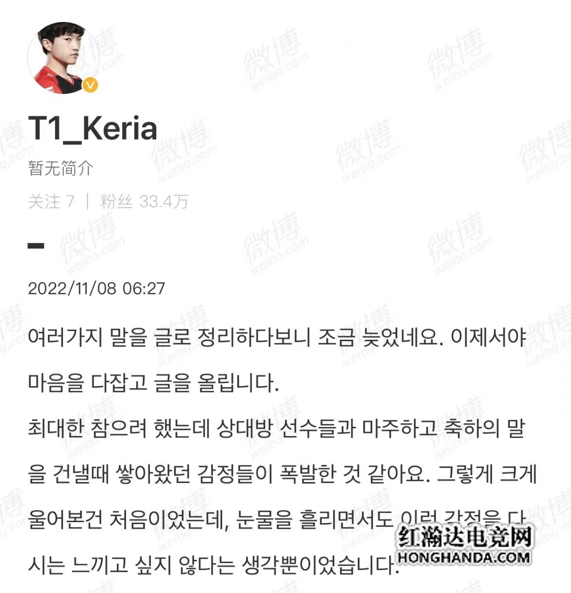Keria说道:虽然说想尽最大的努力忍耐,但是面对对方的选手说出祝贺的话的时候,我的感情好像爆发了。这是我第一次哭的这么厉害,我不想再感受这种心情。但是,无论胜利或失败,那些支持我、安慰我的粉丝们,就觉得我还年轻,还很傻。当我开始当职业选手的时候,我就知道会有胜者和败者,喜悦和挫折感并存的世界。但是为了实现我的目标,这是必要的过程,但是在那之中想过逃避的我,我也会感到自责。