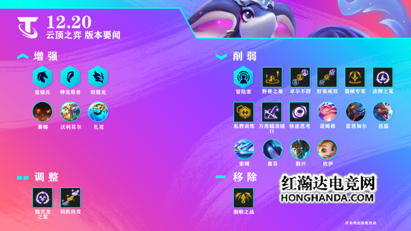 首先是云顶之弈,在这个巨龙之境全球总决赛版本之前的最后一个版本里,会有一个强化符文重新平衡、以及很多平衡性改动!