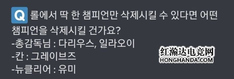 这次DK官方对kkOma教练,Khan和Nuclear做出了采访,上来就问到想要删除的英雄是什么,kkOma说道:诺手,俄洛伊。Khan则是说道:男枪。这个回答也不禁让大家会想起与EDG总决赛的那天,Khan的男枪算是成了心魔。然后Nuclear说道:悠米。然后就是对自己以后孩子在职业上的想法,他们也一致表达了一个想法,就是有天赋就积极支持。最后kkOma表示到,心态最好的就是ShowMaker和Canyon,跟他们一起生活,会发现他们两人的心态很好。
