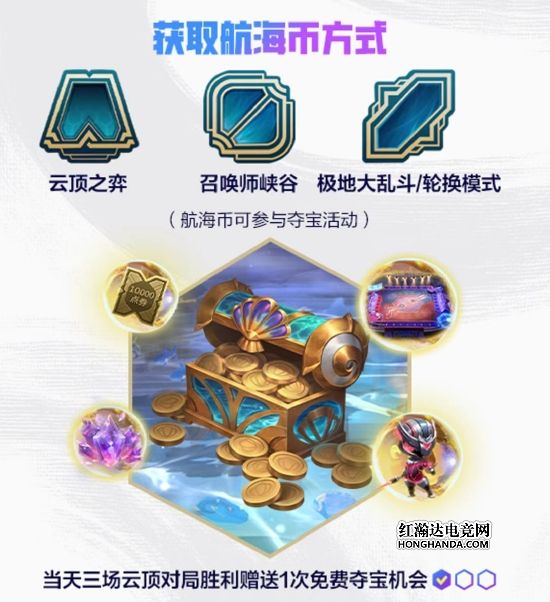 福利7:获得航海币200——积累航海币不伤肝!航海币是这次活动的核心货币,用于参与兑换、航海夺宝、累积里程碑等玩法。(除了云顶之弈模式外,其他英雄联盟游戏模式也同样积累航海币进度)