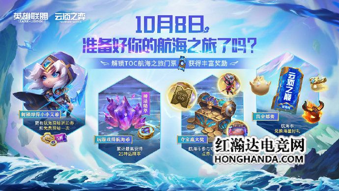 在第四届TOC云顶之弈公开赛期间,“航海之旅”的活动即将开启!解锁门票参加活动,即可畅玩云顶之弈的同时解锁海量道具!完成对局可累积航海币,使用航海币可参与航海夺宝、兑换商城、和领取里程碑奖励如神话精萃等内容。更有全新英雄级小小英雄小小艾希优雅登场,伴你乘风破浪。具体活动详情,请留意后续公告。