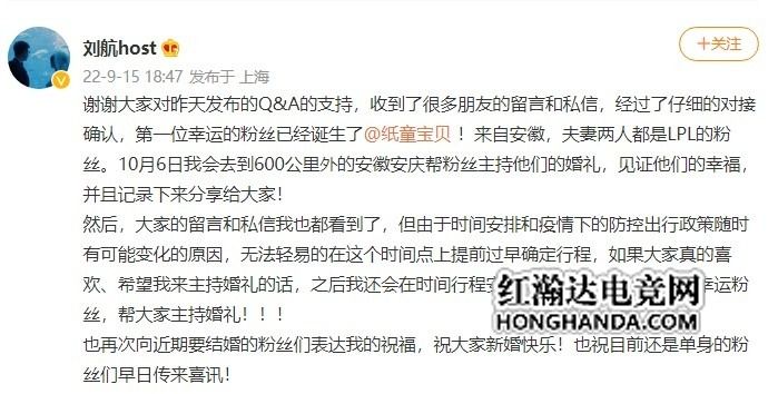 在这之前,刘航承诺过表示会抽取粉丝,去免费主持婚礼,对此刘航发文说道:收到了很多朋友的留言和私信,经过了仔细的对接确认,第一位幸运的粉丝已经诞生了纸童宝贝。来自安徽,夫妻两人都是LPL的粉丝。10月6日我会去到600公里外的安徽安庆帮粉丝主持他们的婚礼,见证他们的幸福,并且记录下来分享给大家!但由于时间安排和疫情下的防控出行政策随时有可能变化的原因,无法轻易的在这个时间点上提前过早确定行程。